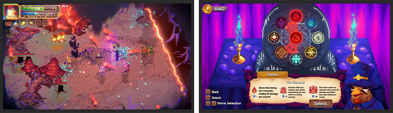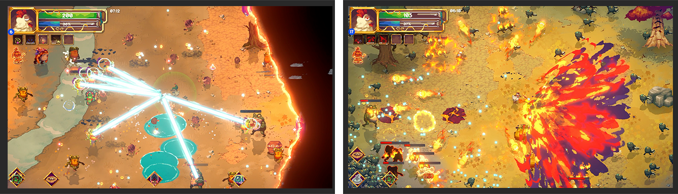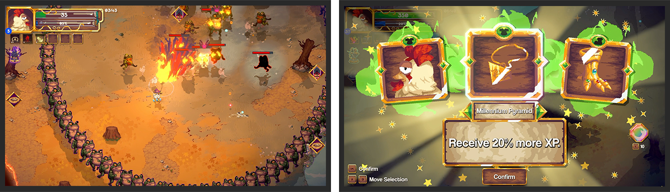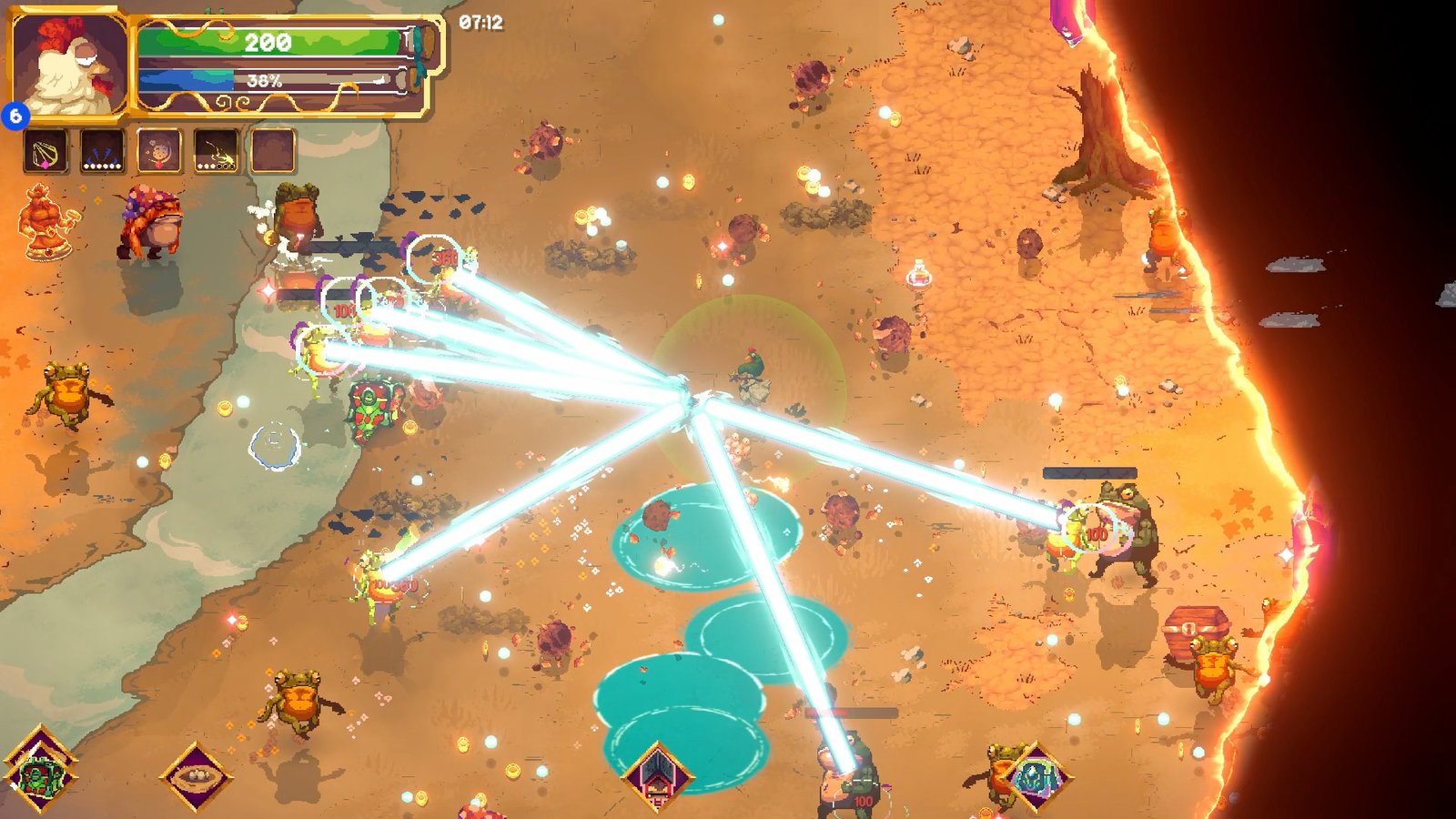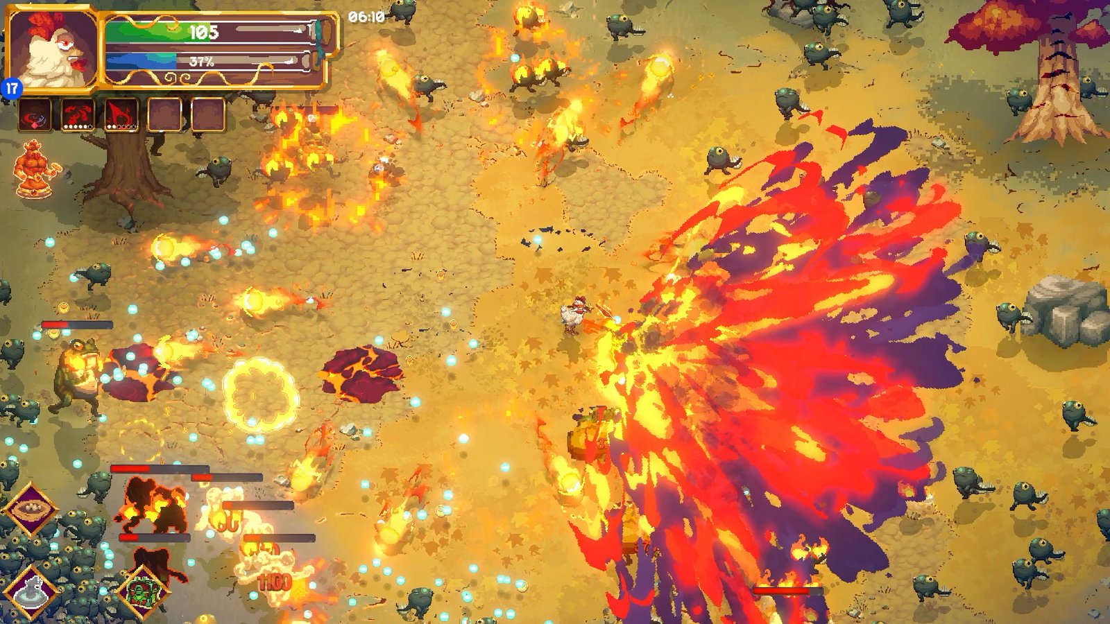 Construa sua varinha e desenvolva própria sua build mágica para se tornar a galinha mais caótica do campo de batalha. Com inúmeras combinações de builds, aniquile hordas de terríveis sapos famintos e detenha os Chefões provando que a galinha é IMPLACÁVEL.