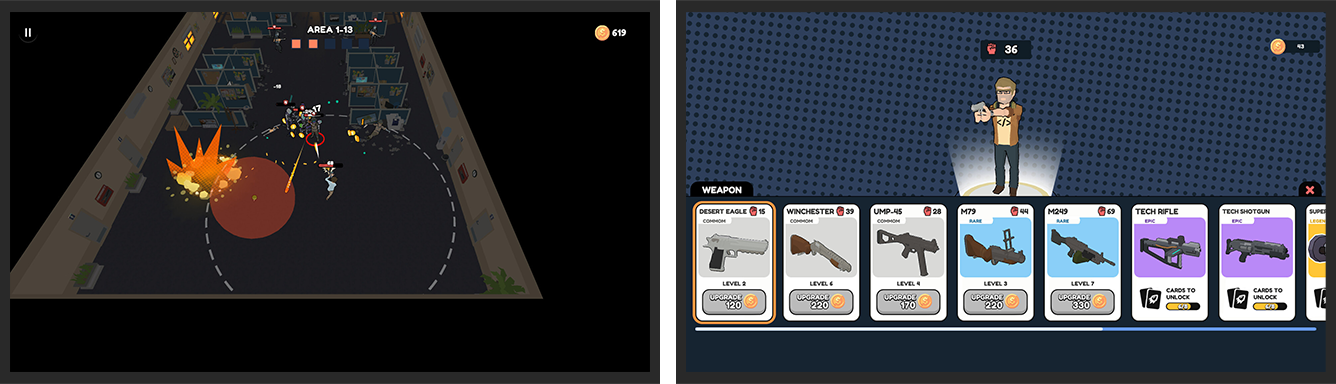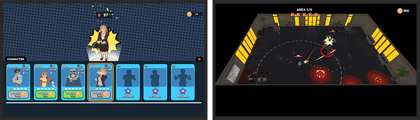 Enfrente ondas de inimigos em fases rápidas e caóticas que só aumentam de dificuldade. Colecione armas e combine upgrades para criar estratégias absurdas. Cada personagem começa com vantagens próprias. Descubra novos inimigos e ambientes diferentes a cada bloco de fases.